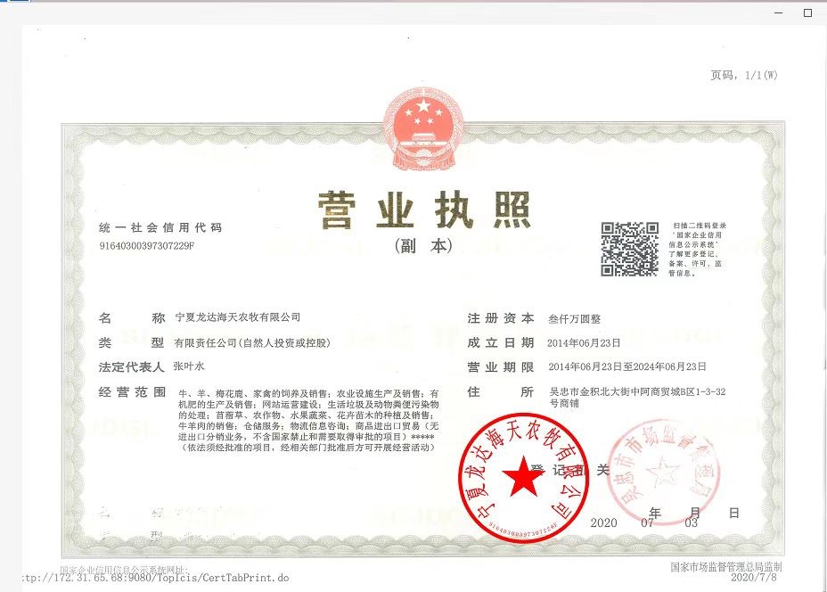 寧夏龍達海天農(nóng)牧有限公司 此公司營業(yè)執(zhí)照已上傳驗證